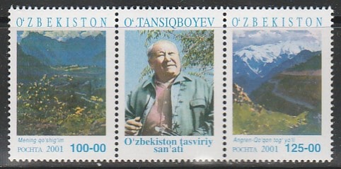 Узбекистан 2001 год. Советский и узбекский художник Урал Тансыкбаев, 2 марки с купоном в сцепке. (3,5)