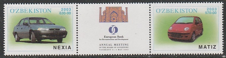 Узбекистан 2003 год. Ежегодное заседание ЕБРР в Ташкенте. Автомобилестроение, 2 марки с купоном.