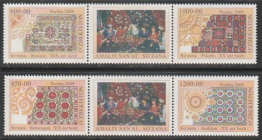 Узбекистан 2009 год. Гобелены с узкой вышивкой "Сусани", 4 марки с купонами.
