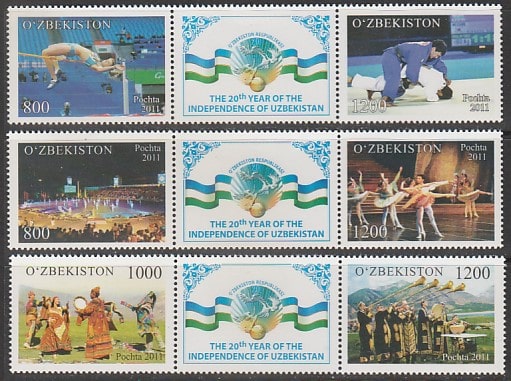 Узбекистан 2011 год. 20 лет Независимости. Спорт и культура, 6 марок с купонами (3 сцепки) (18,5)
