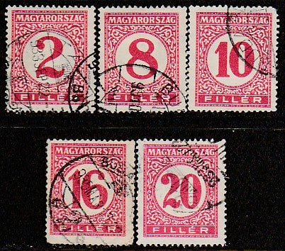 Венгрия 1929/1931 год. Цифровой рисунок в круге, 5 доплатных марок из серии (гашёные) (5 из 6)