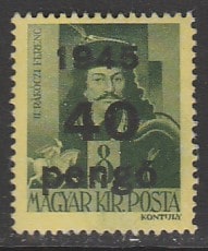 Венгрия 1945 год. Стандарт. Князь Трансильвании Ференц II Ракоци, НДП, 40 Р/8 f, 1 марка из серии (наклейка)