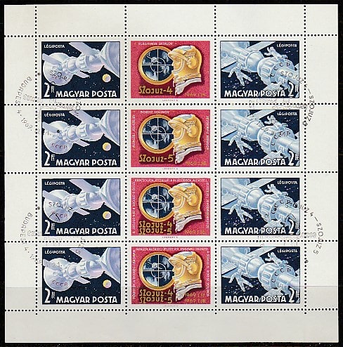 Венгрия 1969 год. Космический полёт кораблей "Союз-4" и "Союз-5", малый лист (спецгашение первого дня) (6/6)