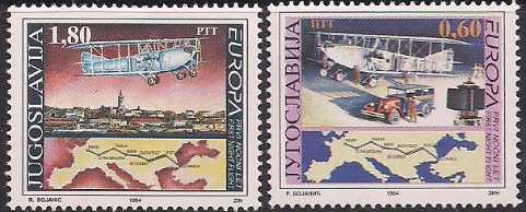 Югославия 1994 год. Европа. Изобретения и открытия. Самолеты. 2 марки(4.5м)