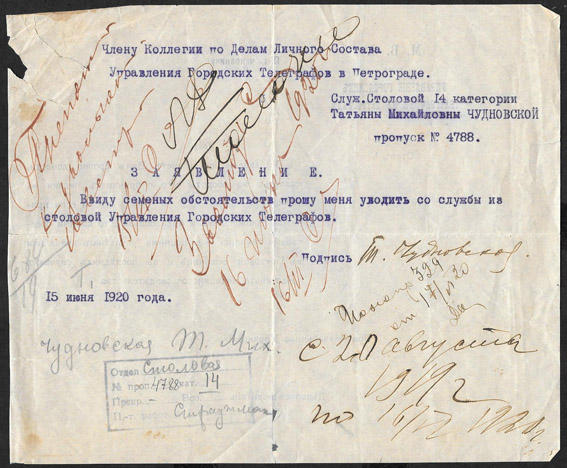 Заявление об увольнении на бланке Управления городских телеграфов в Петрограде, 1920 год