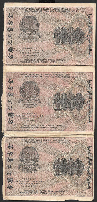 1000 рублей 1919 год. ВЗ - горизонтальный номинал. Лист 3 шт.