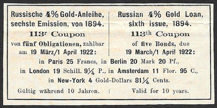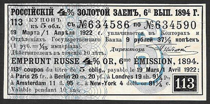 113 купон к 5 облигациям с № 634586 по № 634590. Российский золотой заем