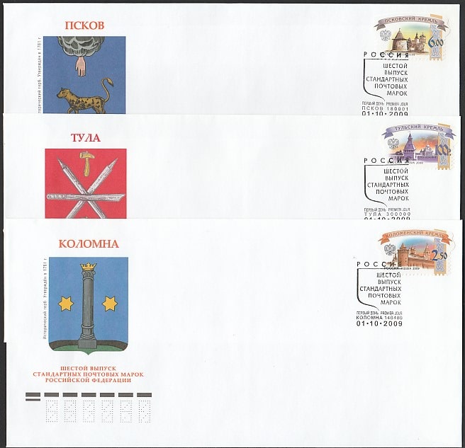 12 КПД. Шестой выпуск стандартных почтовых марок РФ. Города. Архитектура, 01.10.2009 год, Астрахань, Зарайск, Коломна, Ростов, Н. Новгород, В. Новгород, Псков, Москва, Рязань, Тобольск, Тула, Казань