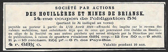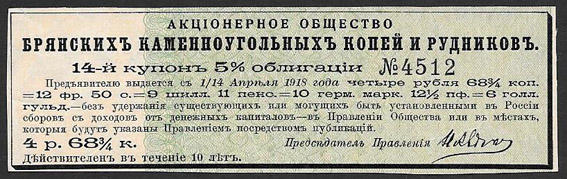 14 купон 5% облигации № 4512 Акционерное общество Брянских каменноугольных копей и рудников