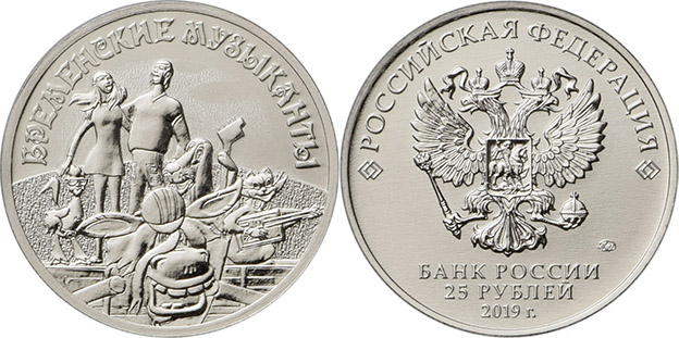 25 рублей 2019 год. Российская (советская) мультипликация Бременские музыканты, 1 монета