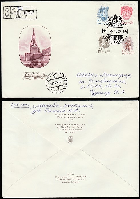 3 КПД. Стандартный выпуск, 25.12.1989 год, Москва, почтамт, заказные, прошли почту