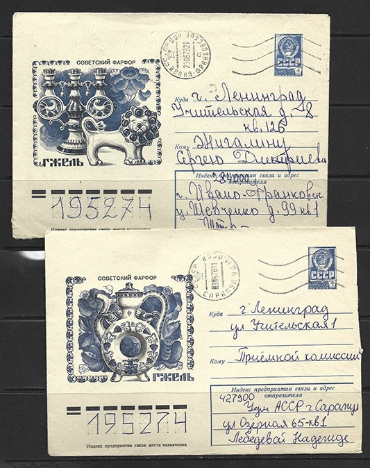 4 конверта прошли почту. Советский фарфор. Гжель. 1978 год