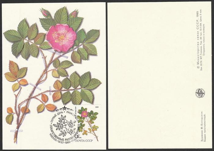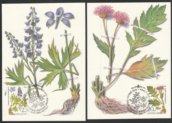 5 Картмаксимумов. Лекарственные растения. Спецгашение "ПД" 10.07.85 г.