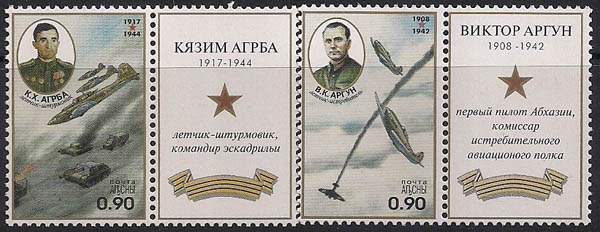 Абхазия 1998 год. Военные лётчики В. Аргун и К. Агрба. истребители и штурмовики, танки, грузовики. 2 марки с купонами (003.290)