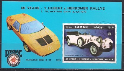 Аджман 1970 год. Автомобили. Гашеный блок без зубцов