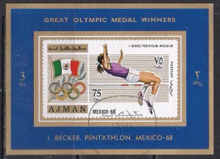 Аджман 1972 год. Летние Олимпийские игры в Мексике в 1968 году. Гашеный блок без зубцов