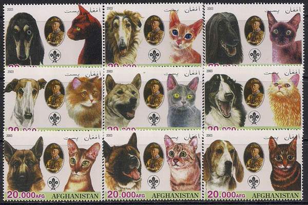 Афганистан 2003 год. Кошки и собаки. Основатель скаутского движения. Р. Баден-Пауэлл. 9 марок