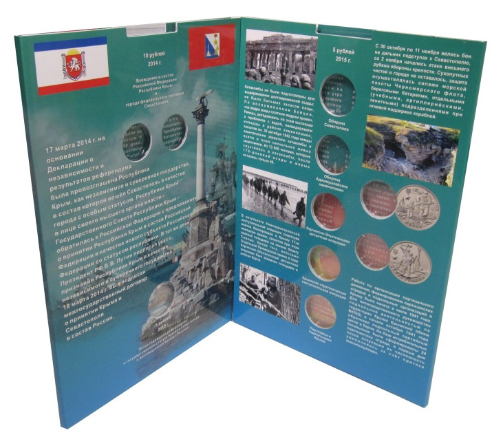 На 10 монет номиналом: 2,5 и 10 рублей + банкнота 100 рублей России 2015 г., Присоединение Крыма и г. Севастополь к РФ