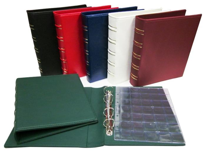 Размер 230х270 мм. Искуственная кожа. Имеет 2 листа на 12 ячеек, 3 листа на 20 ячеек, 3 листа на 35 ячеек, 2 листа на 48 ячееки. Все листы с клапанами.