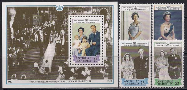 Антигуа и Барбуда 1988 год. Свадьба Елизаветы второй и принца Филипа. Блок и 4 марки