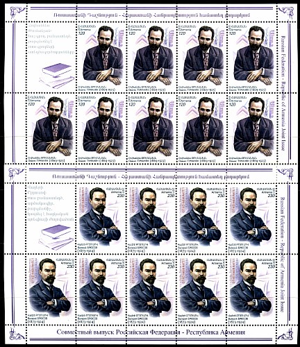 Армения 2011 год. Совместный выпуск с Россией. Писатели Ованес Туманян и Валерий Брюсов. 2 листа с купонами