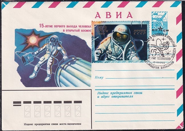 Авиа ХМК со спецгашением "15-летие первого полета человека в космос", 18.03.1980 год, Космодром Байконур (ВВ)