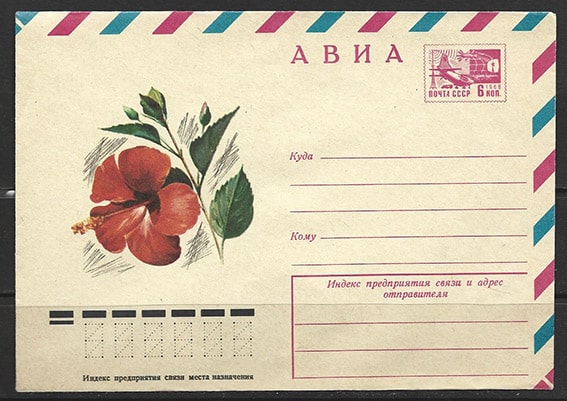 Авиа конверт Хибискус (китайская роза), 13.05.1977 год