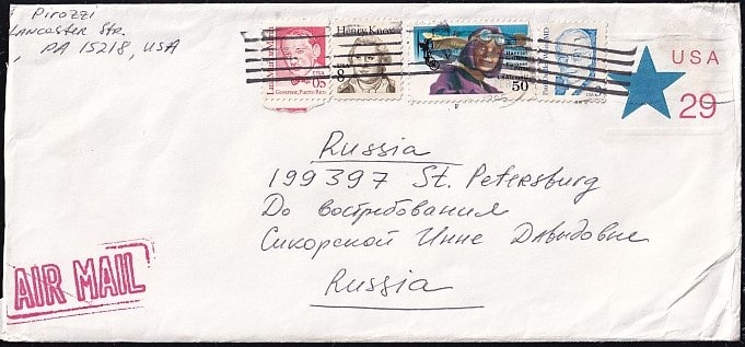 Авиа Конверт США Персоналии, 1995 год, прошел почту