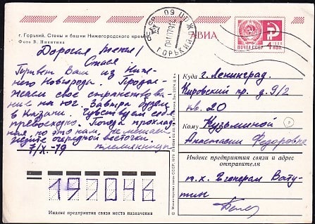 Авиа ПК Горький. Стены и башни Нижегородского кремля. Выпуск 2.02.1979 год, прошла почту