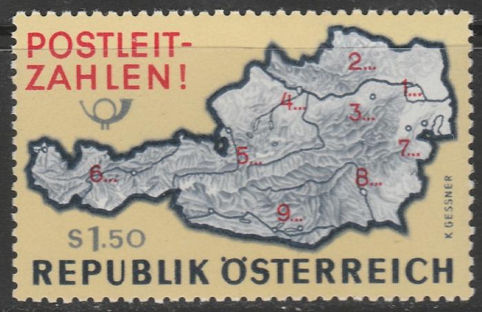 Австрия 1966 год. Карта Австрии, размеченная по почтовым индексам. 1 марка