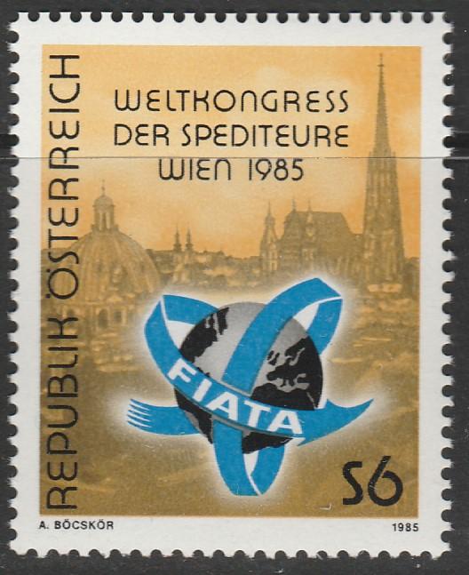 Австрия 1985 год. Всемирный конгресс экспедиторов. Эмблема конгресса. Городской пейзаж Вены. 1 марка