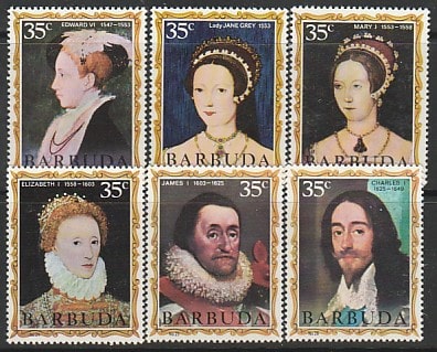 Барбуда 1970 год. Короли и королевы Англии, 6 марок (наклейка) (IV)