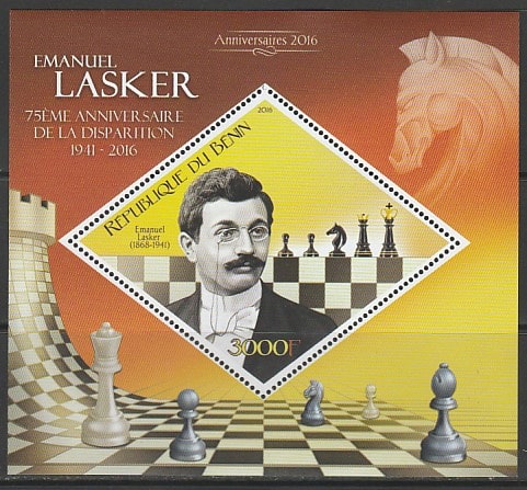Бенин 2016 год. Второй чемпион мира по шахматам Эмануэль Ласкер, блок. Сувенирный выпуск.