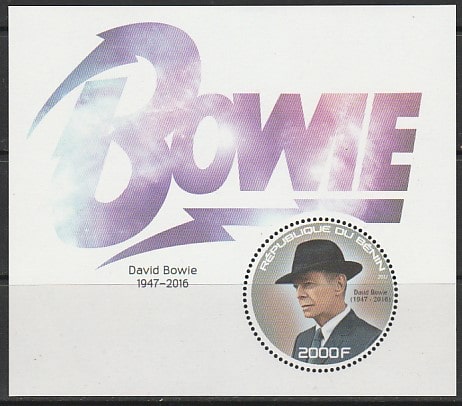 Бенин 2017 год. Британский рок - музыкант Дэвид Боуи, блок. Сувенирный выпуск.