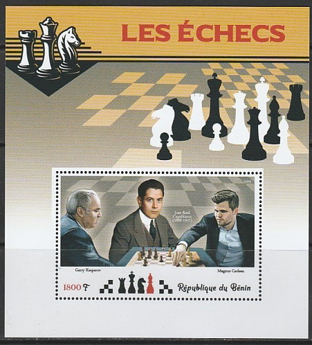 Бенин 2019 год. Чемпионы мира по шахматам: Капабланка, Карпов, Магнус Карлсен, блок.