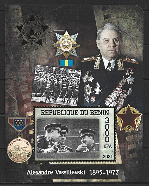 Бенин 2021 год. Александр Михайлович Василевский, блок, тиснение золотом