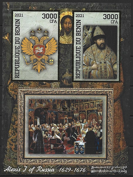 Бенин 2021 год. Алексей Михайлович, малый лист, тиснение золотом