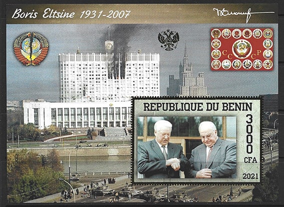 Бенин 2021 год. Борис Ельцин, беззубцовый блок, тиснение золотом