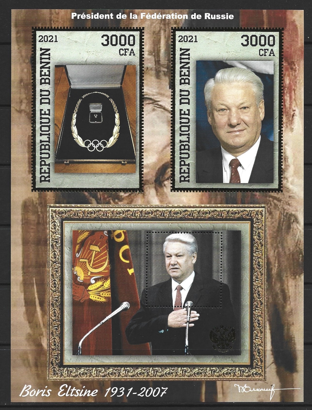 Бенин 2021 год. Борис Ельцин, блок, тиснение золотом