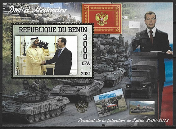 Бенин 2021 год. Дмитрий Медведев и Мохаммед ибн Рашид Аль Мактум, блок, тиснение золотом