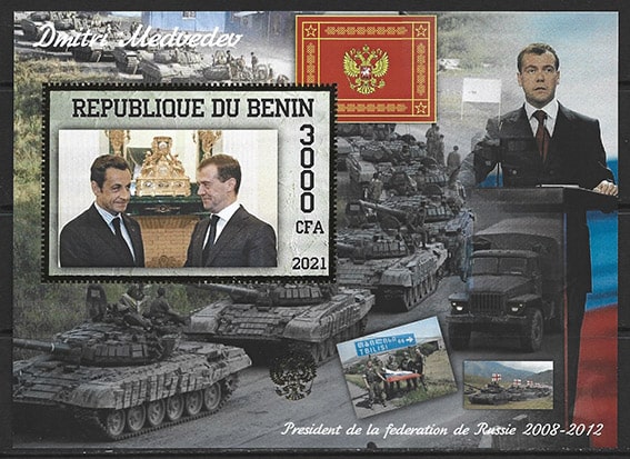 Бенин 2021 год. Дмитрий Медведев и Николя Саркози, блок, тиснение золотом