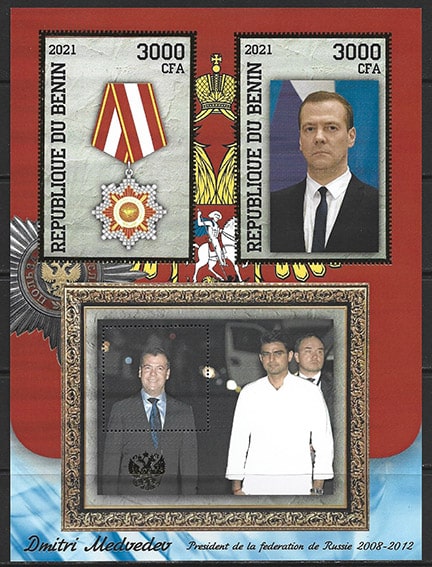 Бенин 2021 год. Дмитрий Медведев и Пилот Сачин, малый лист, тиснение золотом
