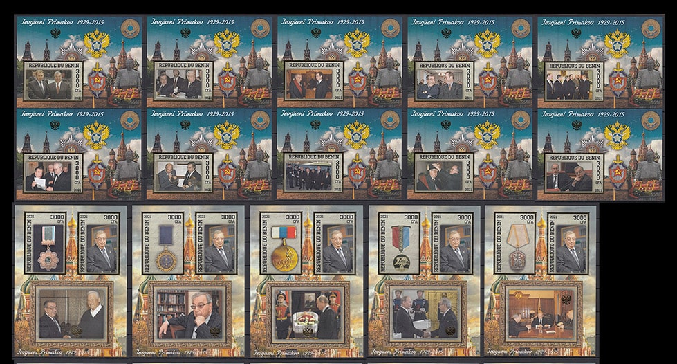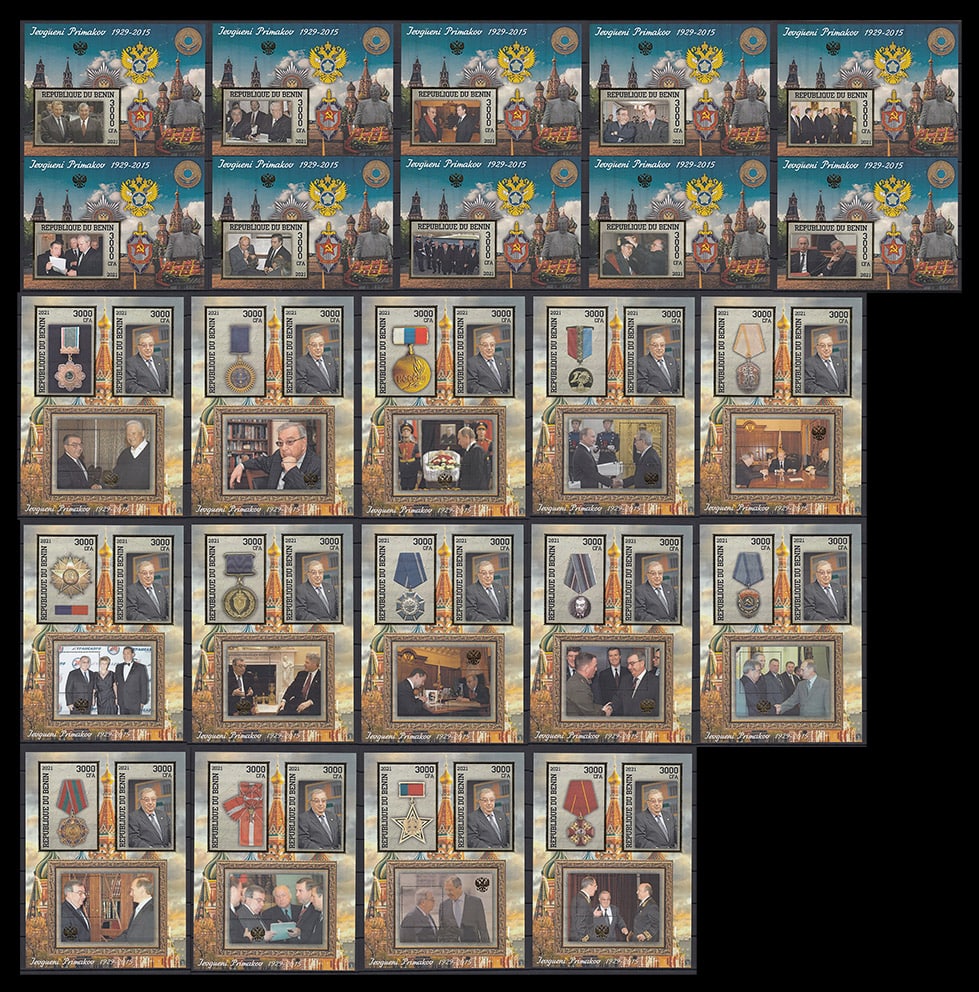Бенин 2021 год. Евгений Примаков, золотая рамка, 10 б/з блоков, 14 малых листов