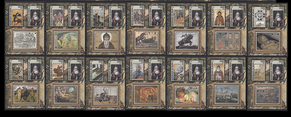 Бенин 2021 год. Илья Муромец, золотая рамка, 10 б/з блоков, 14 малых листов