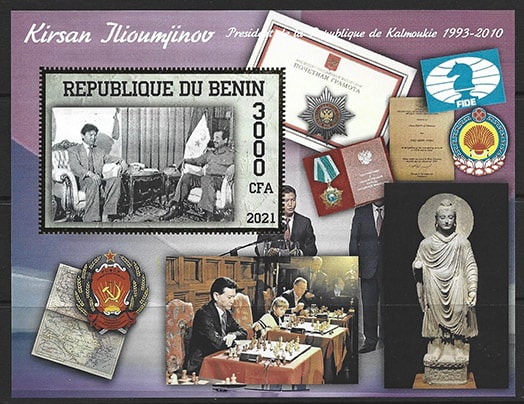 Бенин 2021 год. Илюмжинов Кирсан, шахматы, беззубцовый блок, тиснение золотом