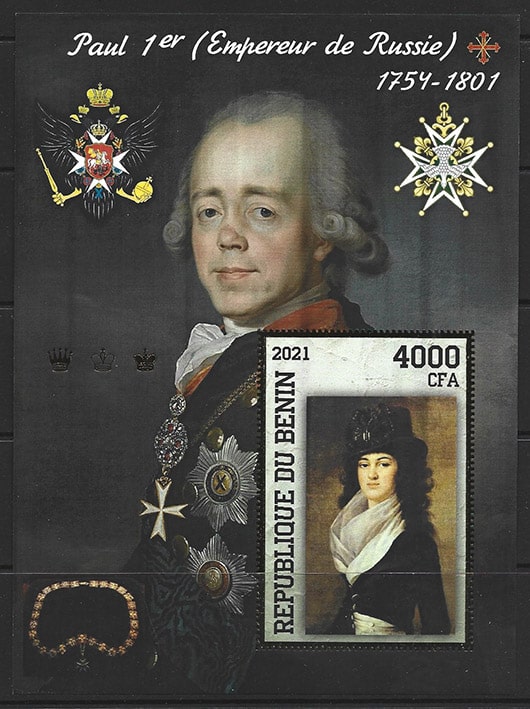 Бенин 2021 год. Император Павел I. Беззубцовый блок, тиснение золотом