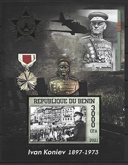 Бенин 2021 год. Конев, полководец, беззубцовый блок, тиснение золотом