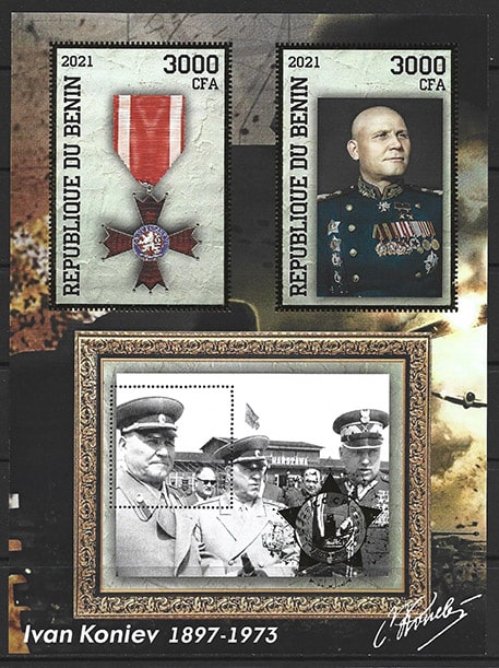 Бенин 2021 год. Конев, полководец, малый лист, тиснение золотом