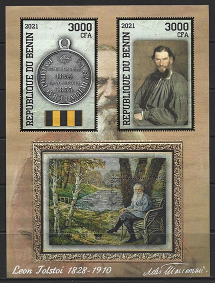 Бенин 2021 год. Лев Толстой, малый лист, тиснение золотом