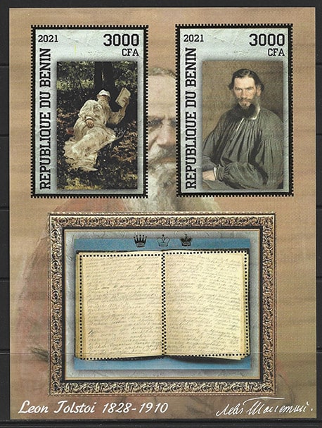 Бенин 2021 год. Лев Толстой, малый лист, тиснение золотом